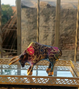 “Beautiful 5-inch multicolor brass bull, handcrafted from pure brass by skilled Pakistani artisans – a timeless décor piece proudly made in Pakistan.”
