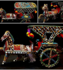 “Handmade Shahi Baghi with mirror work, vibrant colors, and wooden base – a stunning Pakistani handicraft souvenir (14–16 inches approx).”